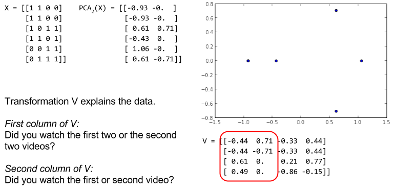 Suppose we have a matrix of data X, whose rows are data points, and whose columns are the feature values of the data points. To be overly concrete, suppose we have a matrix recording whether each of six people has watched each of four movies. Thus, we have a 6×4 binary matrix.