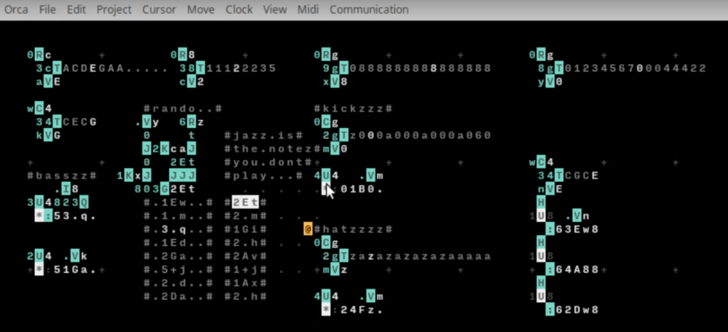 In this post, I’ll give a bit of intro/overview of Orca instructions, and document some recipes I came up with for making a slowly mutating bass/melody pattern. Here’s a video of the Orca programming running; it’s controlling my (terribly underutilized) OP-Z.